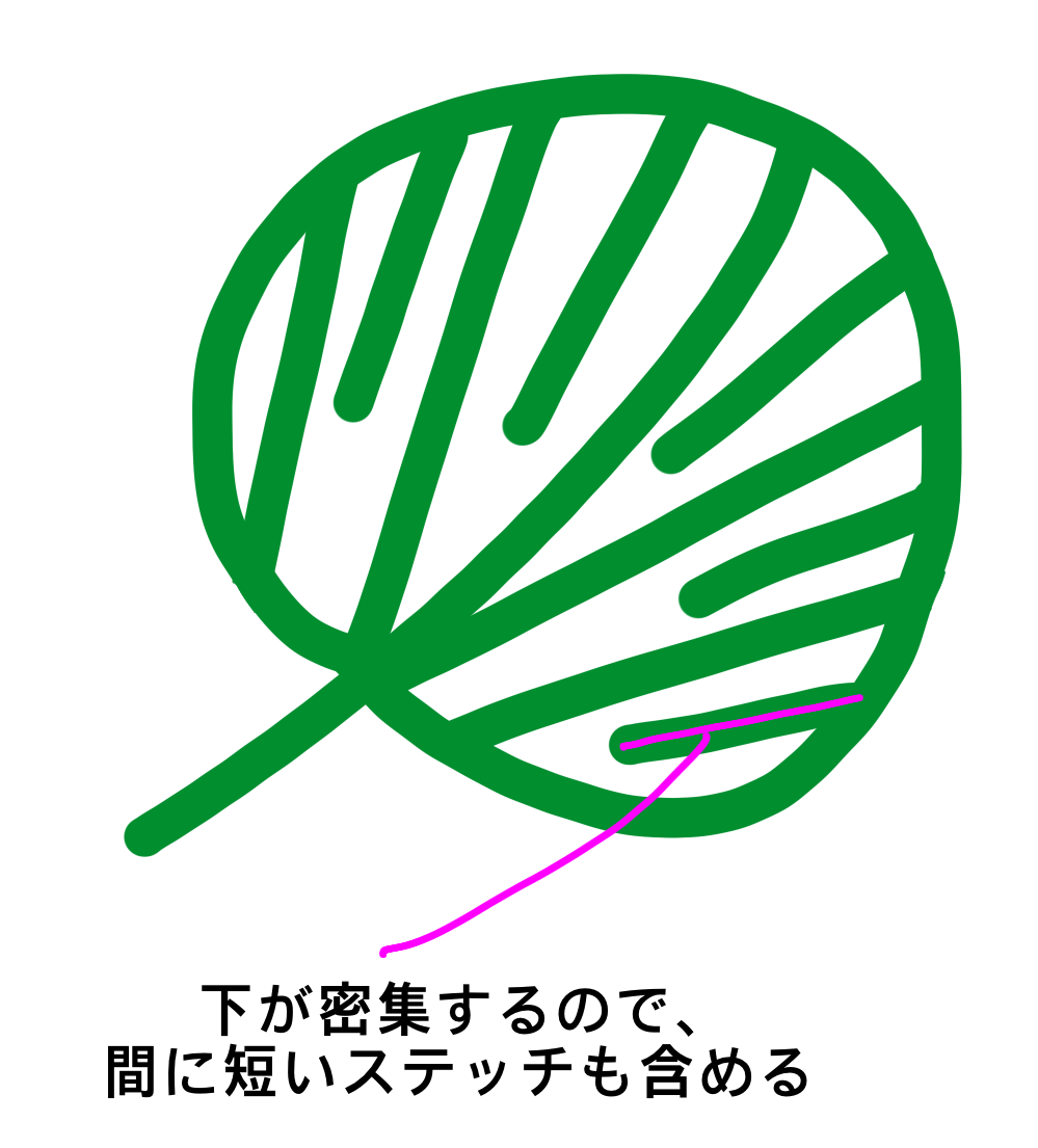 普通にまっすぐにサテンsすると、丸いオブジェクトのようになるので、葉っぱらしく角度をつけてみてはいかがでしょうか。画像をいれておきますね。